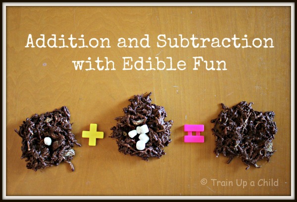 My five year old also did a few addition problems using the nests. I filled the first two nests with some eggs, and he found the sum. We also did a couple subtraction problems this way.